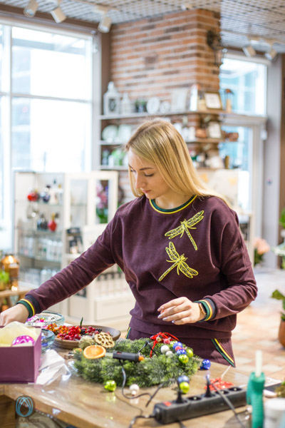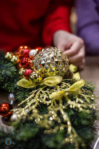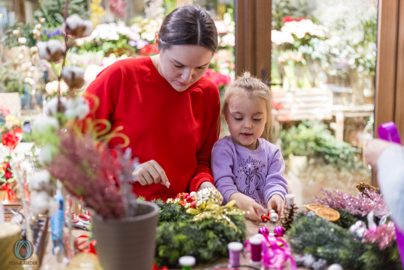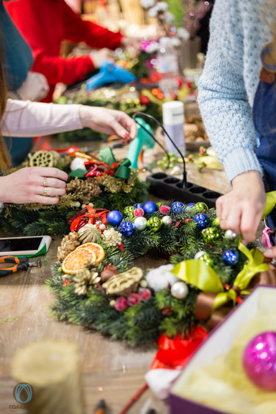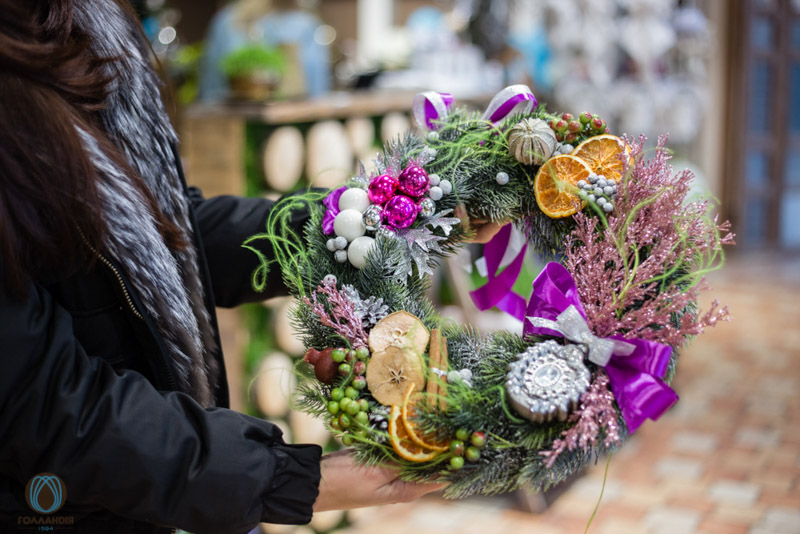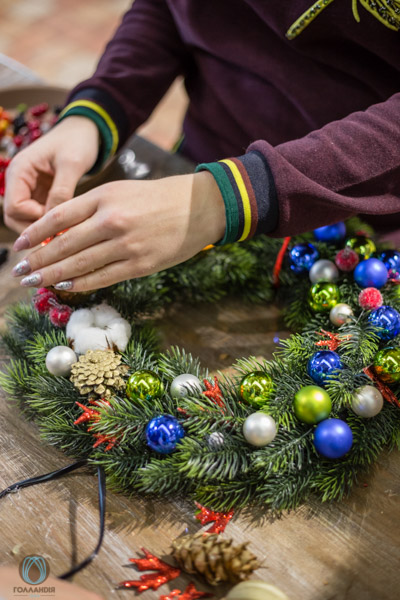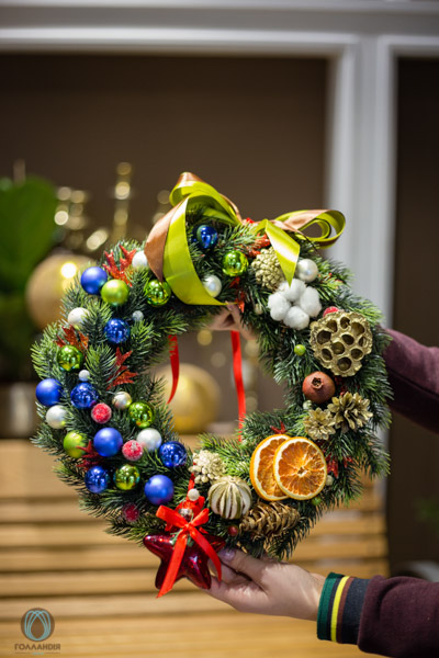 Заранее подготовленный нами венок вы будете декорировать на свой вкус: елочными украшениями, сухофруктами, фактурными элементами и праздничными лентами, подключая всю свою фантазию и праздничное настроение.