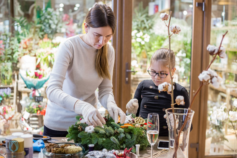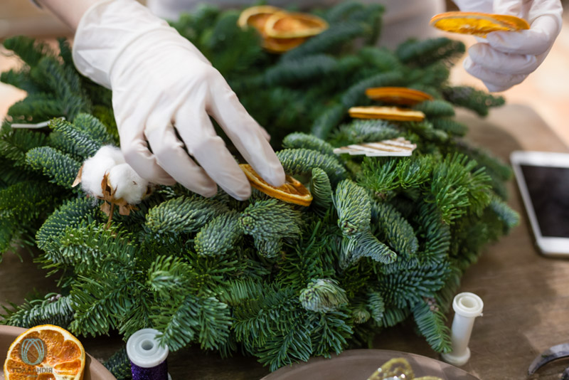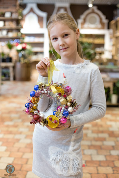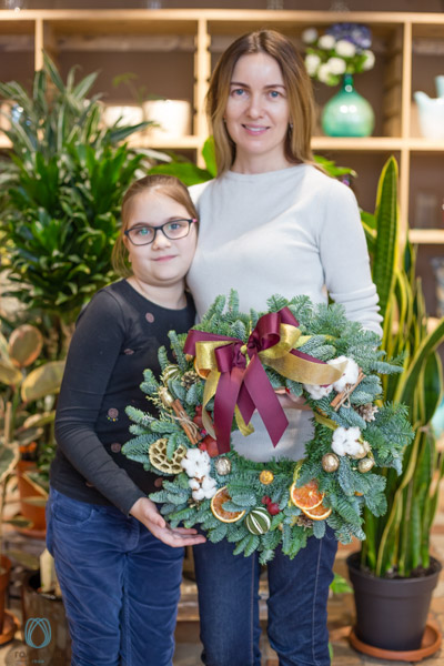 Самый ожидаемый и желанный МК в канун Нового года- “Новогодний венок” с натуральной ели, декорирован праздничным декором, лентами, сухофруктами, припыленный золотом или искусственным снегом.